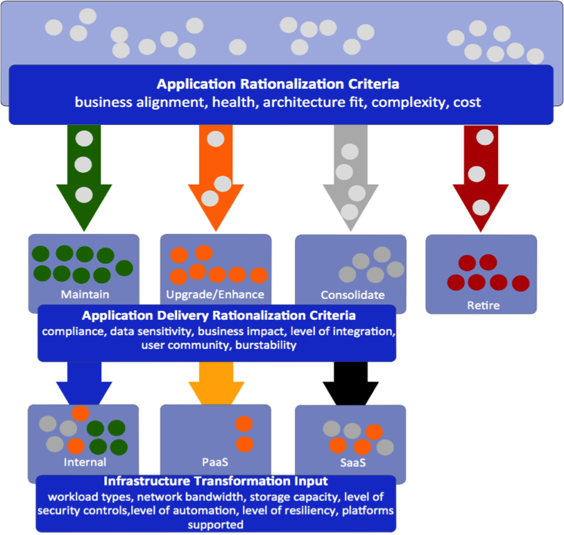 The rationalization process starts with identifying the application portfolio and mapping applications to business processes. Once the future state application portfolio is developed the next step is to rationalize the data and infrastructure environment needed to support it. I’m greatly simplifying the process because there are several steps to execute after application portfolio development.